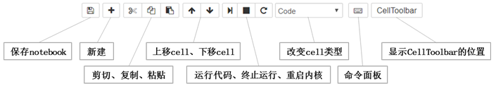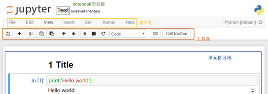 新建Notebook后,进入编辑界面。编辑界面由名称、菜单栏、工具条和cell组成,如图4-3所示。