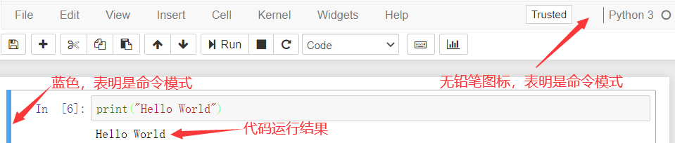 按ESC键或运行cell中的代码,将进入命令模式。命令模式下,铅笔图标消失,cell左侧框线呈蓝色,如图4-6所示。