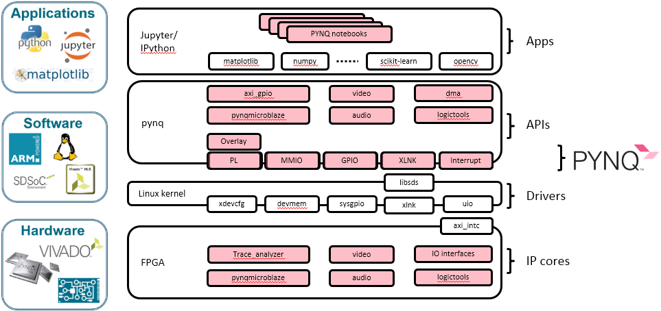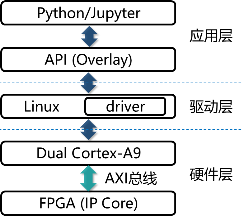 PYNQ官网给出了如图1-3所示的PYNQ软硬件架构图。