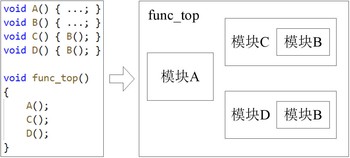 需要注意的是,在图1-5中函数B被调用了2次。如果在运行时,这2处调用不会同时执行,那么HLS工具将为函数B生成一个 运行时可重用 的电路模块实例;否则,将生成2个电路模块实例。