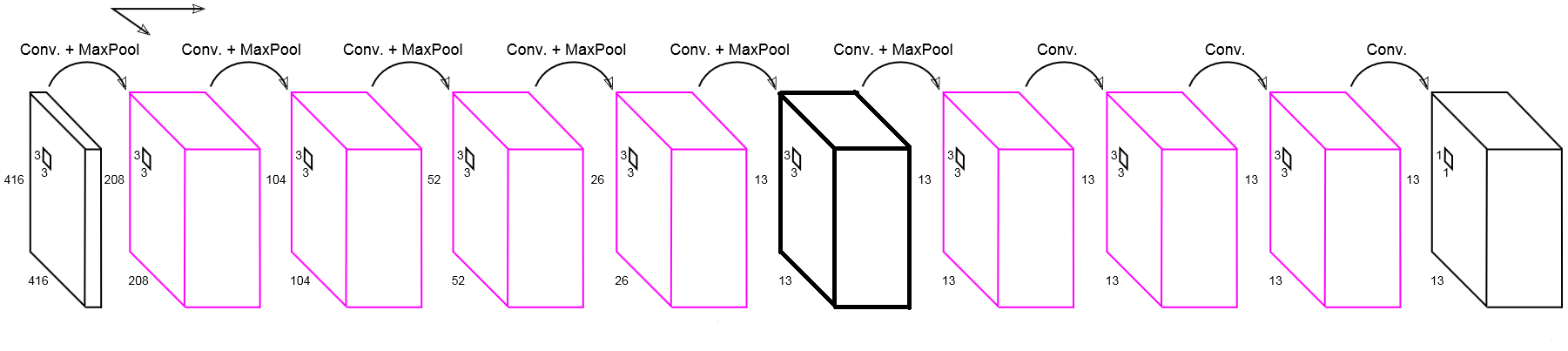 3)将YOLOv1的输入图片尺寸从448×448调整为416×416,这是为了使得特征图的高和宽都是