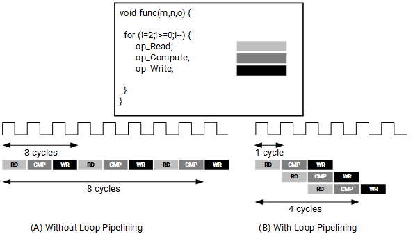 流水线是一种常用的利用时间重叠原理提高处理器性能的并行优化方法,如图1-20所示。示例程序的循环体含有读数据、计算和写数据3个操作。假设使用HLS将该循环体综合成硬件后,循环体中的每个操作都需要一个时钟周期的时延。若循环体需要循环n次,则图1-20(A)所示的串行执行方式总共需要3n个时钟周期,吞吐量为3个周期;而图1-20(B)所示的流水线执行方式只需要n+2个时钟周期,吞吐量为1个周期。