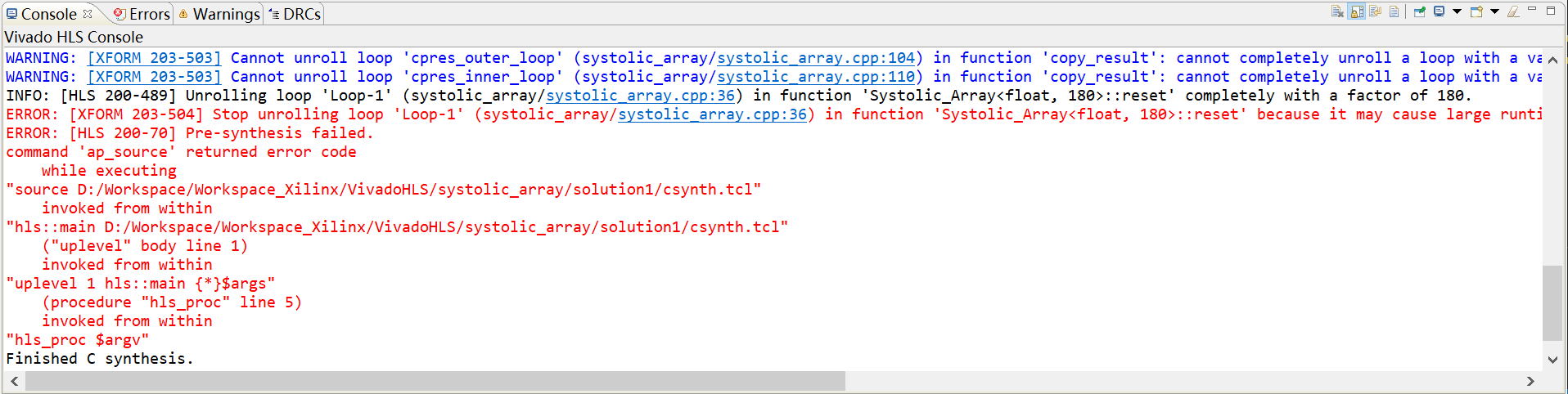 此时说明所添加的制导语句不能被实现,需要删除之。例如进行了不合理的循环展开,而芯片资源无法满足展开,进而报错。