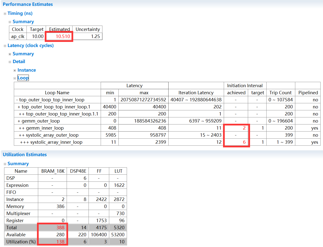 当流水线存在数据依赖,或访问存储器(即数组)出现结构冲突时,也会导致不能满足设定的II。此时,需要进行相应的优化(如消除依赖关系、使用数组划分等方法解决结构冲突等)。