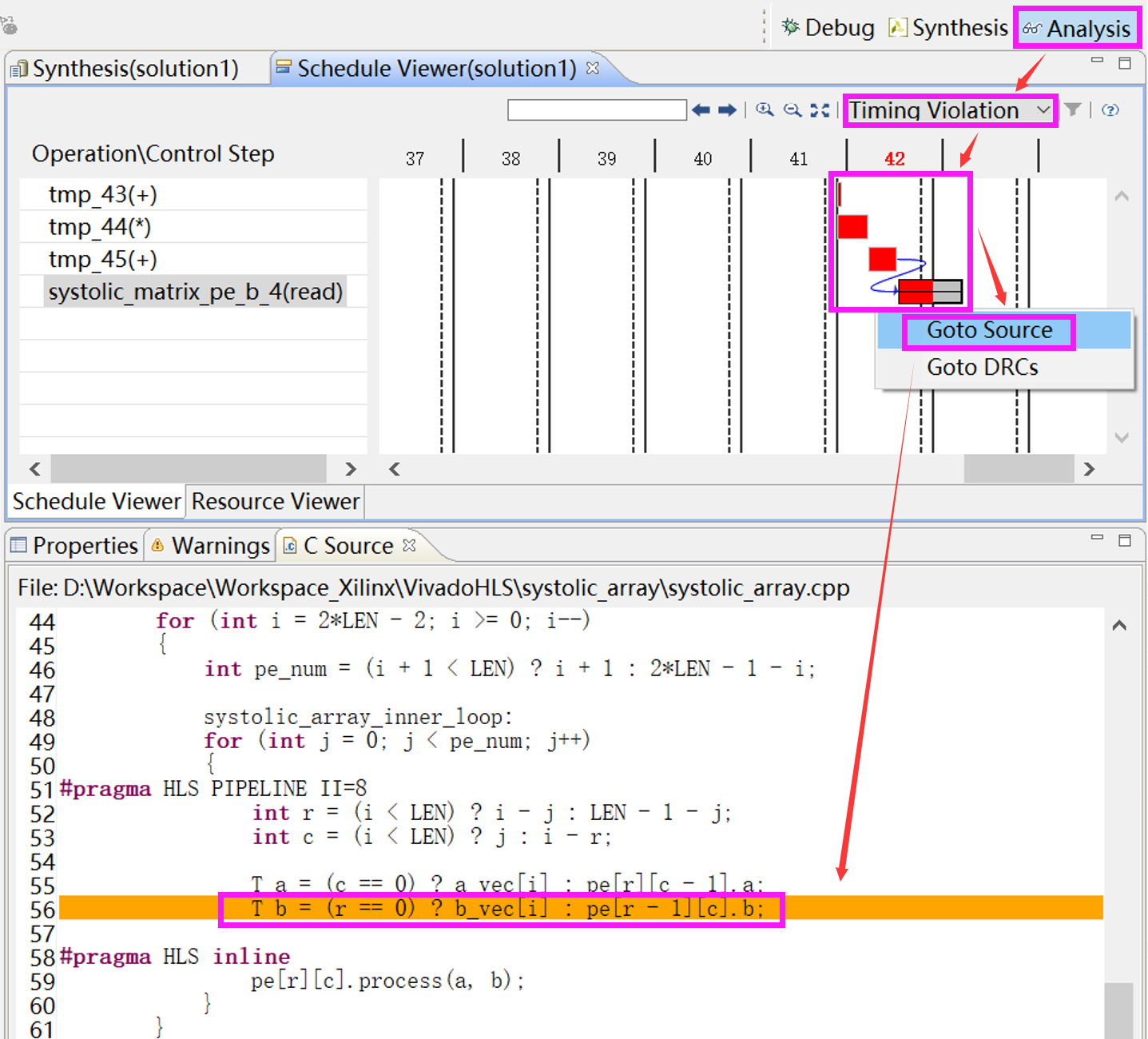 对于图1-22中的Timing报警,可以通过HLS的分析功能找到时序违例,如图1-23所示。
