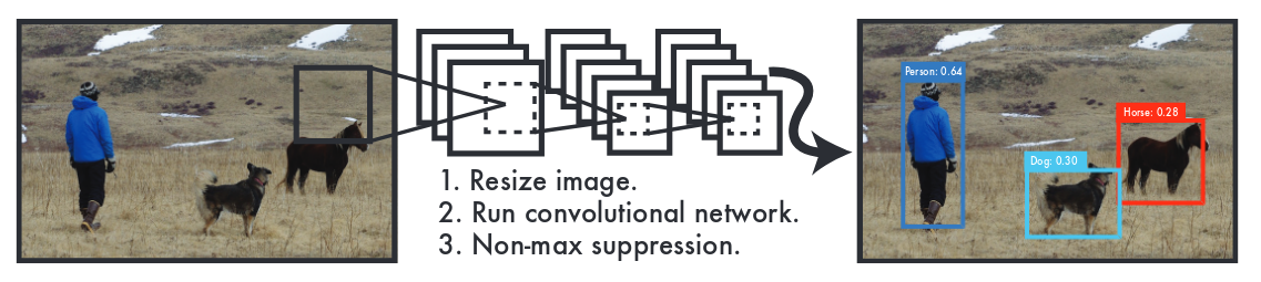 YOLOv1通过CNN中的卷积操作提取图像特征,并通过全连接层对BBox中可能存在的目标对象进行预测,得到每个BBox的置信度。计算出全部BBox的置信度后,就可以得出图片中包含的目标对象的分类信息。