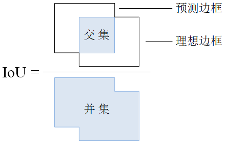 其中,表示含有目标对象的可能性,是所预测边框与理想候选框之间的交并比(Intersection Over Union, IoU),代表了所对应的候选边框的准确度,如图1-5所示。IoU越接近1,表示预测边框准确度越高,越接近理想的候选边框。