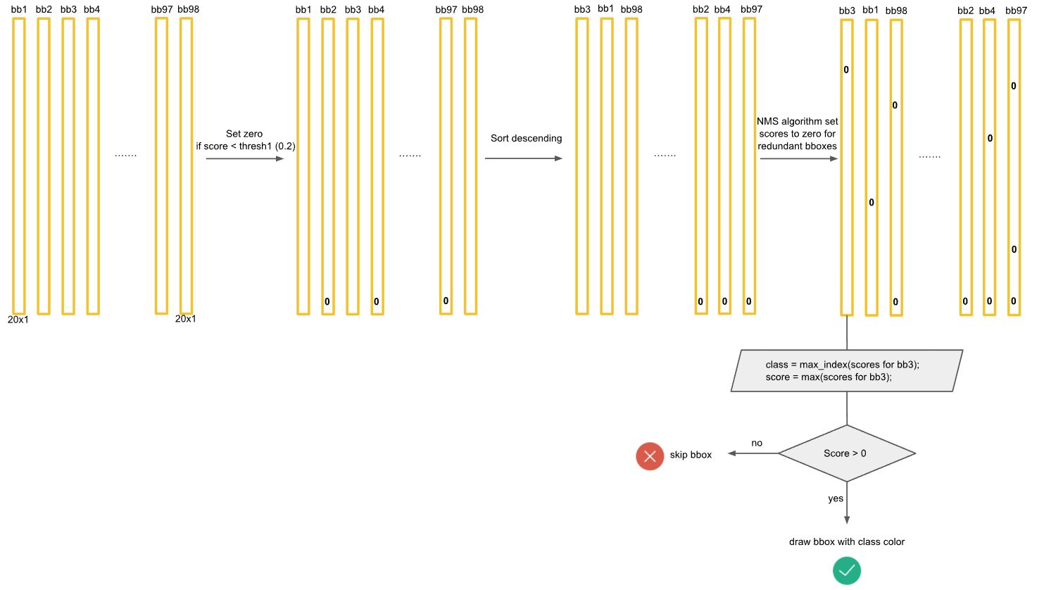 分析图1-9,可知YOLO算法使用NMS进行预测时,大致可分4个步骤: