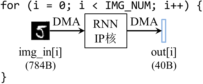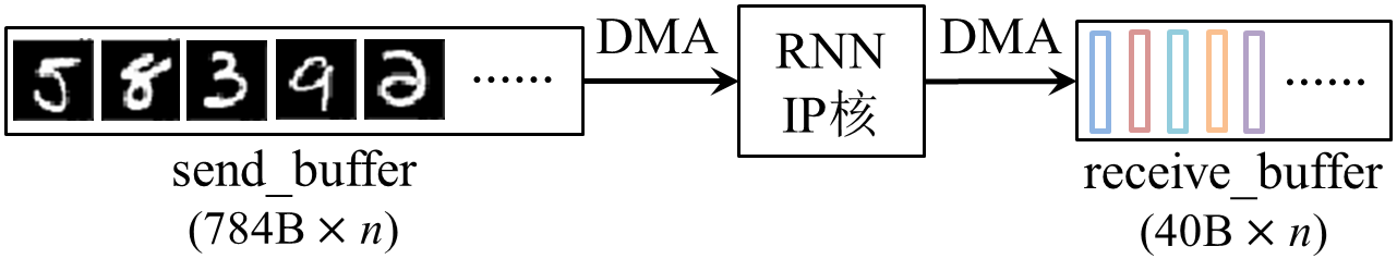 已知在DMA的实际带宽达到饱和之前,单次DMA传输的数据批量越大,PS和PL之间进行数据通信能够获得的带宽就越大,加速器整体性能就越高。因此,如果可以将待预测的所有手写数字图片合并成一个大批量数据,一次性传输到RNN IP核进行前向推导,并一次性返回所有图片的预测结果,那么DMA的带宽将得到更充分的利用,如图3-2所示。