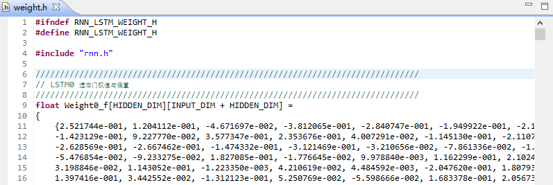 在必做题中,我们利用PyTorch训练RNN网络,并将训练好的网络参数导出后保存在HLS工程的weight.h头文件中,如图3-3所示。