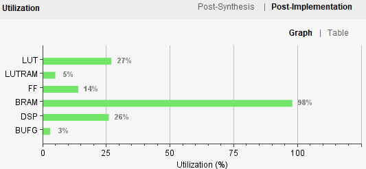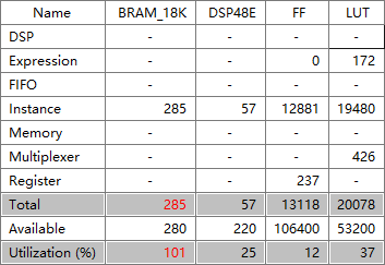 由图3-1可知,RNN的网络参数是以FP32格式存储的,因而最终生成的RNN加速器消耗了PYNQ-Z2的大量Block RAM存储资源,如图3-4所示。