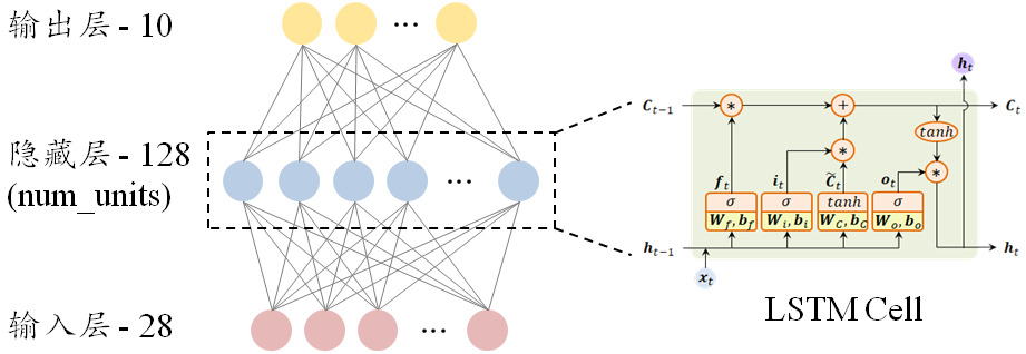 MNIST数据集的每一张手写数字图片都是一个28×28的二维矩阵。为此,可采用包含输入层、LSTM Cell和输出层的RNN网络,且输入层包含28个神经元,隐藏层的LSTM Cell包含128个神经元(num_units为128,即dim() = 128),而输出层则包含10个神经元,代表手写数字图片所具有的10个分类结果。该RNN的网络结构如图1-11所示。