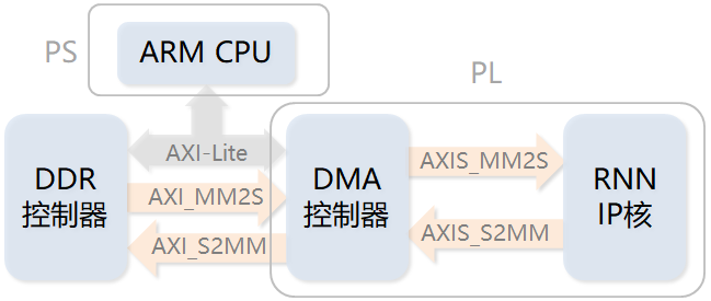 在图1-14中,RNN加速器主要由PS端的ARM CPU、PL端的RNN加速IP核、PL端的DMA控制器和DDR控制器组成。PS端的ARM CPU用于对加速系统进行必要的初始化,比如在运行时加载Overlay、配置DMA控制器等;此外还负责对RNN网络推导所需的数据进行预处理,比如对MNIST数据集进行解析等。DDR控制器用于解析PS和PL对板上DDR存储器的访问请求,并向DDR存储芯片发出相应的读写信号。DMA控制器用于实现PS与PL之间的快速数据传输,以提高加速器的整体性能。RNN硬件IP核用于实现RNN网络前向推导的硬件加速,是整个硬件加速系统的核心运算部件。