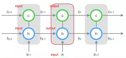 观察图1-6中时刻t所对应的LSTM Cell,可知在时刻t,Cell接受三个输入,分别是当前时刻的外部输入、前一时刻的输出与单元状态;产生两个输出,分别是当前时刻的对外输出与单元状态。