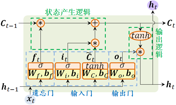 接下来,逐一介绍LSTM Cell的遗忘门、输入门、输出门以及状态产生逻辑和输出逻辑,如图1-8所示。