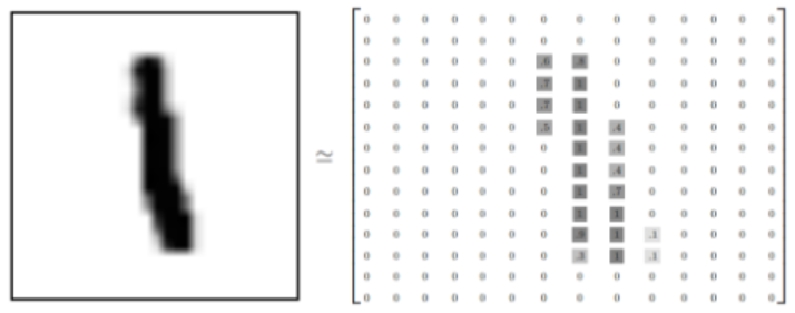 不妨将输入的手写数字图片的每一行看作是一个行向量,则每一张手写数字图片都可以表示成一个包含28个行向量的列向量,如图1-12所示。